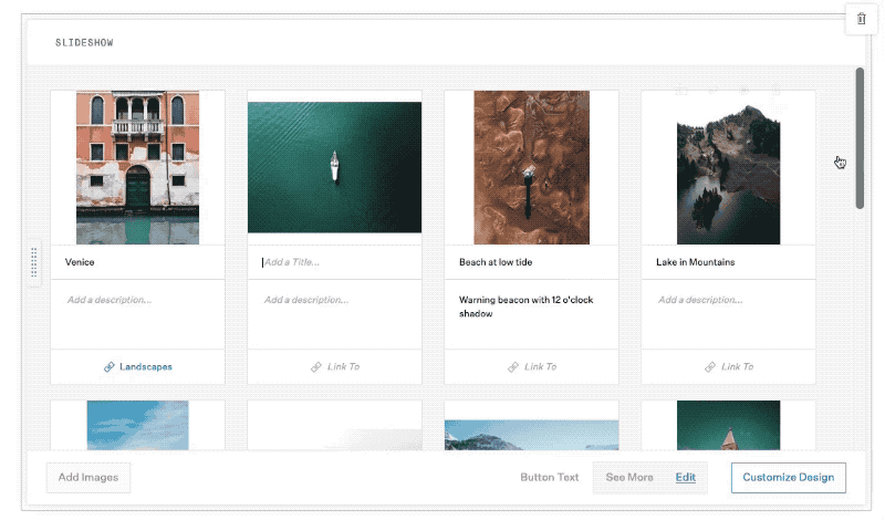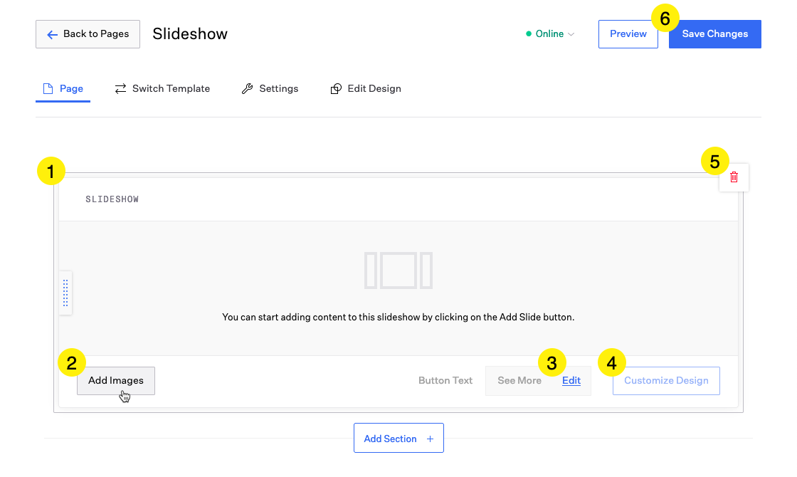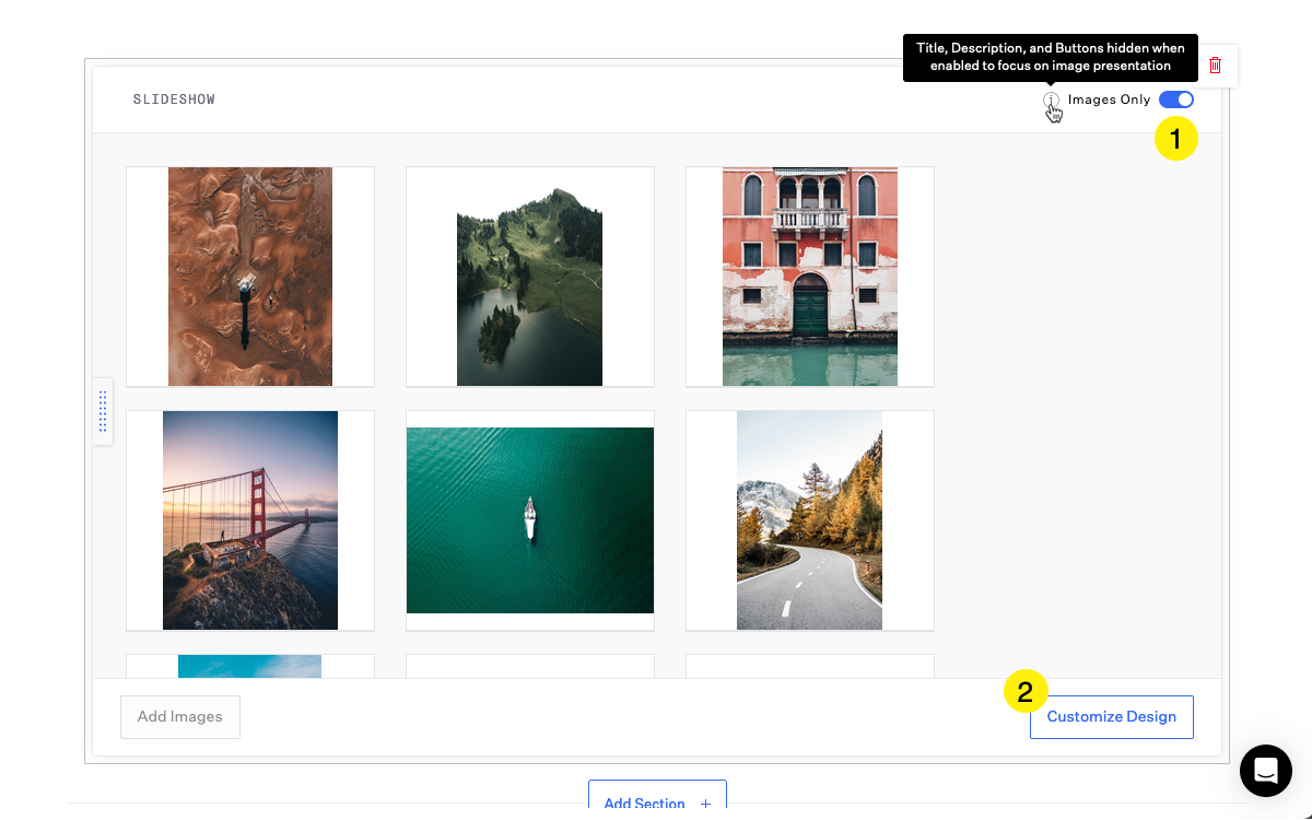 In the upper-right corner of the Slideshow section, you can toggle the switch to turn ON (blue) the 'Images Only' option. This will hide the Title, Description, and Buttons from appearing and focus on image presentation.