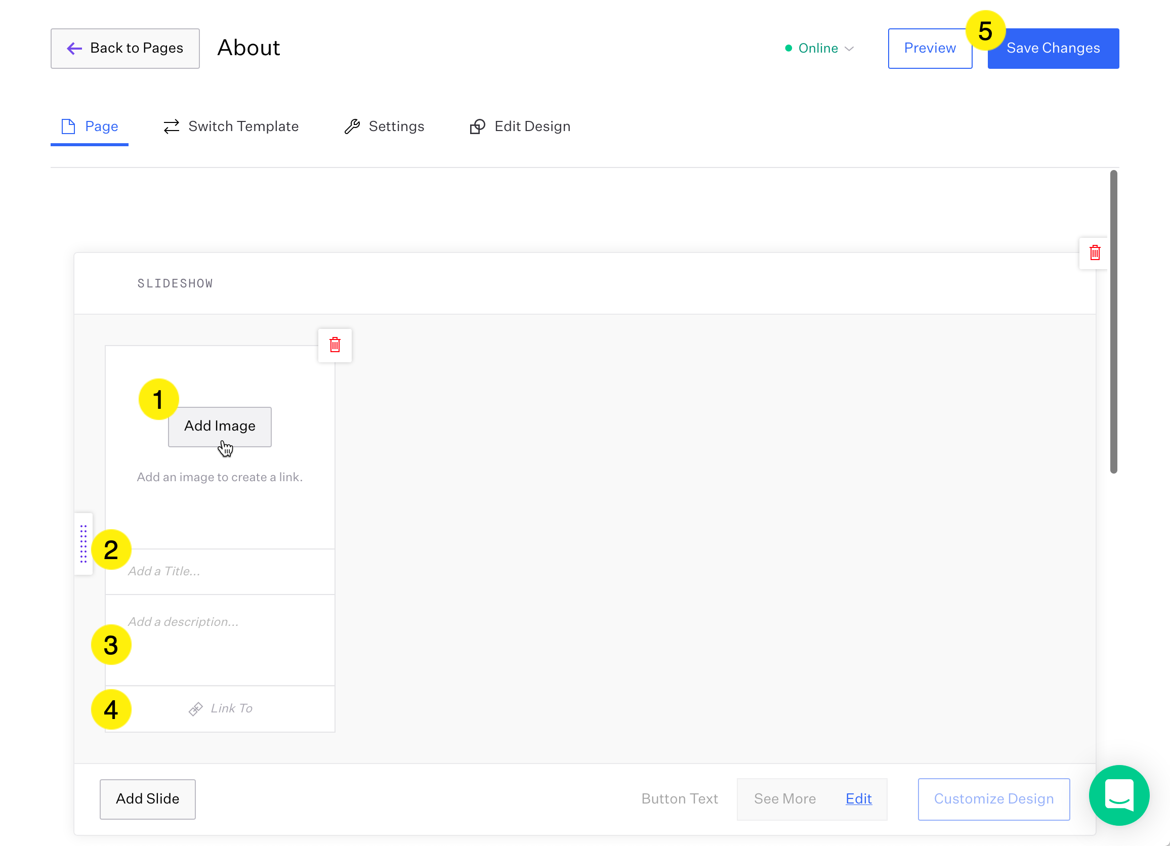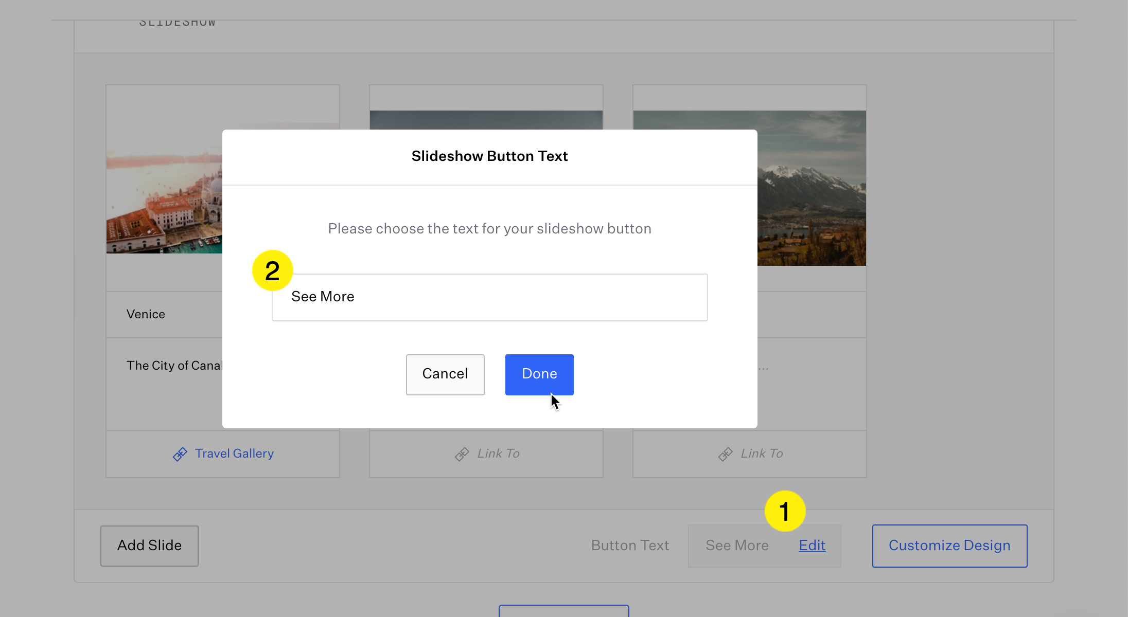 Customize Design, set fonts, font sizes, text color, opacity, button style, navigation style, counter style, autoplay, animation (options differ between Slideshow templates)