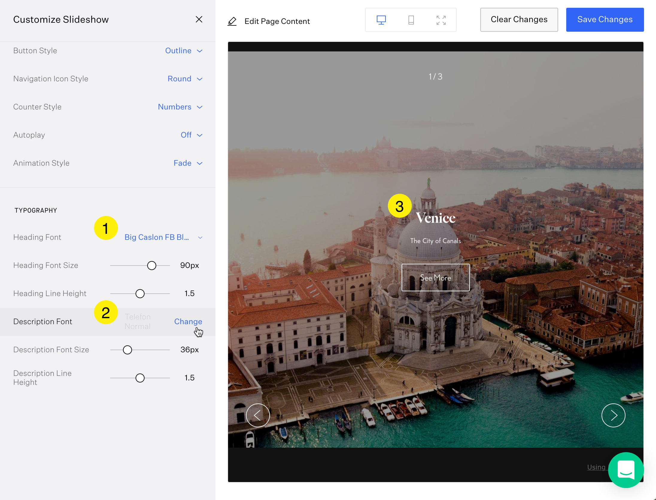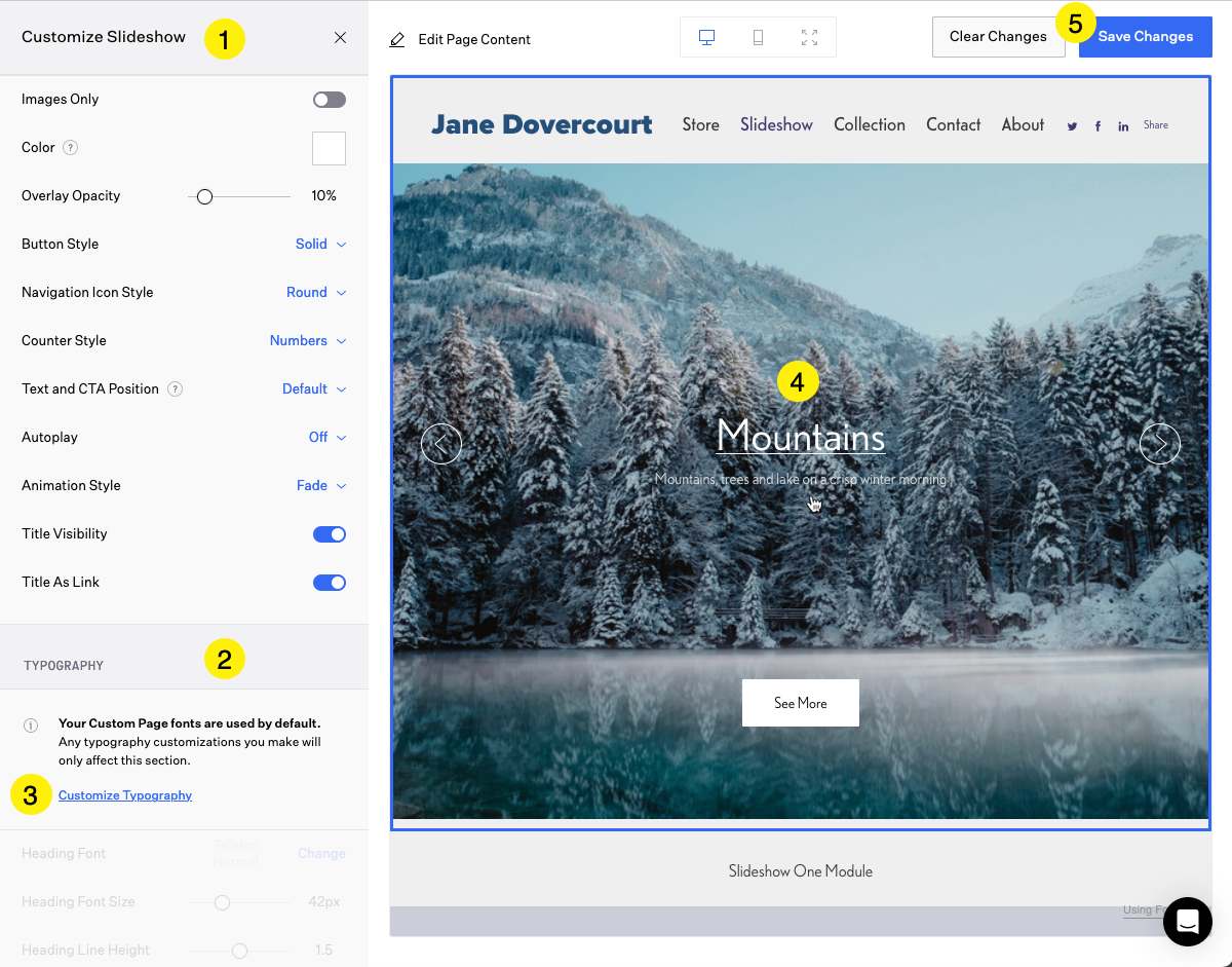 Typography. Your Custom Page fonts are used by default; any typographic customizations you make will only affect this Slideshow
