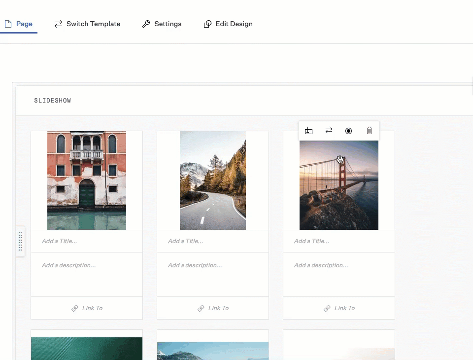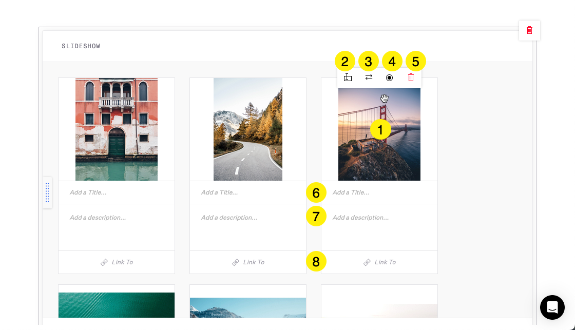 You can change the order of any of the images in the slideshow by clicking on the image thumbnail you want to move and dragging and dropping this over the thumbnail or the position where you want the image to be moved to.