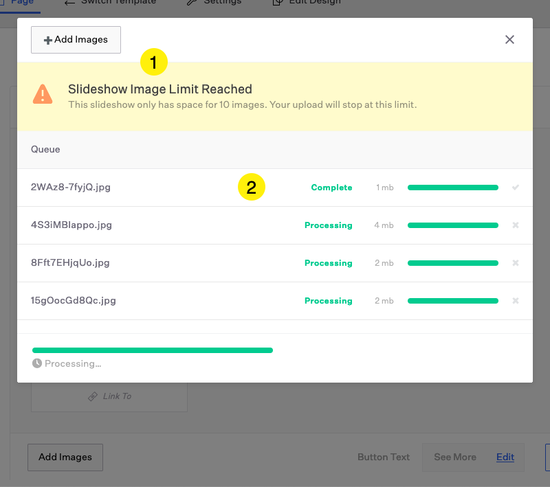 Slideshow Image Limit Reached will be displayed if you try to upload (or add) more than ten (10) images