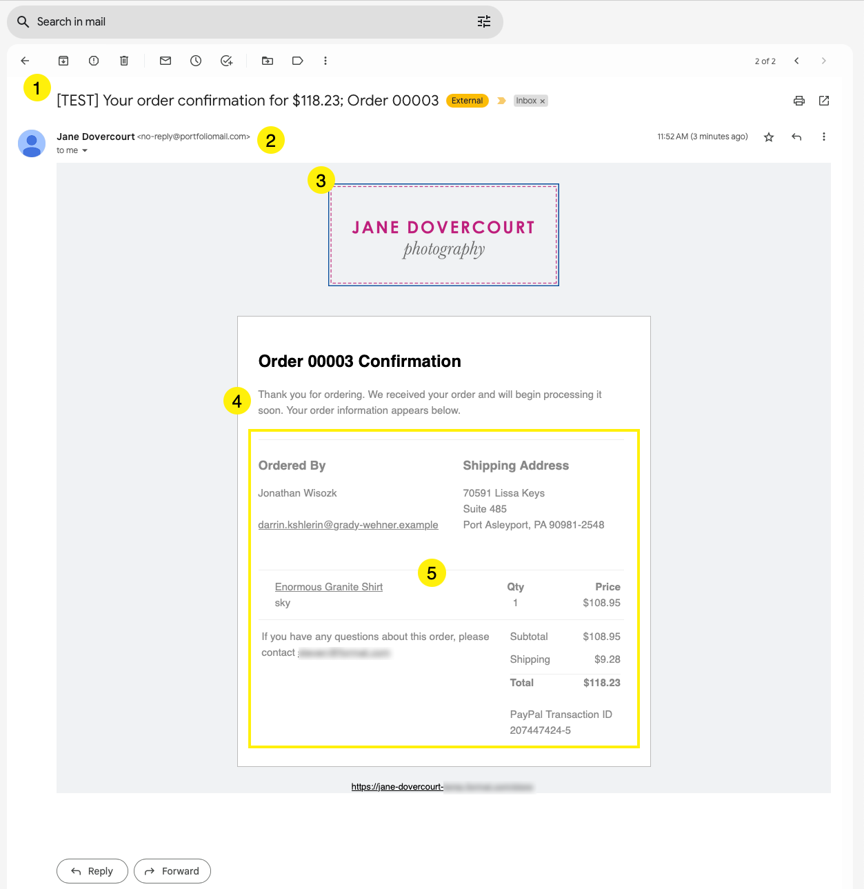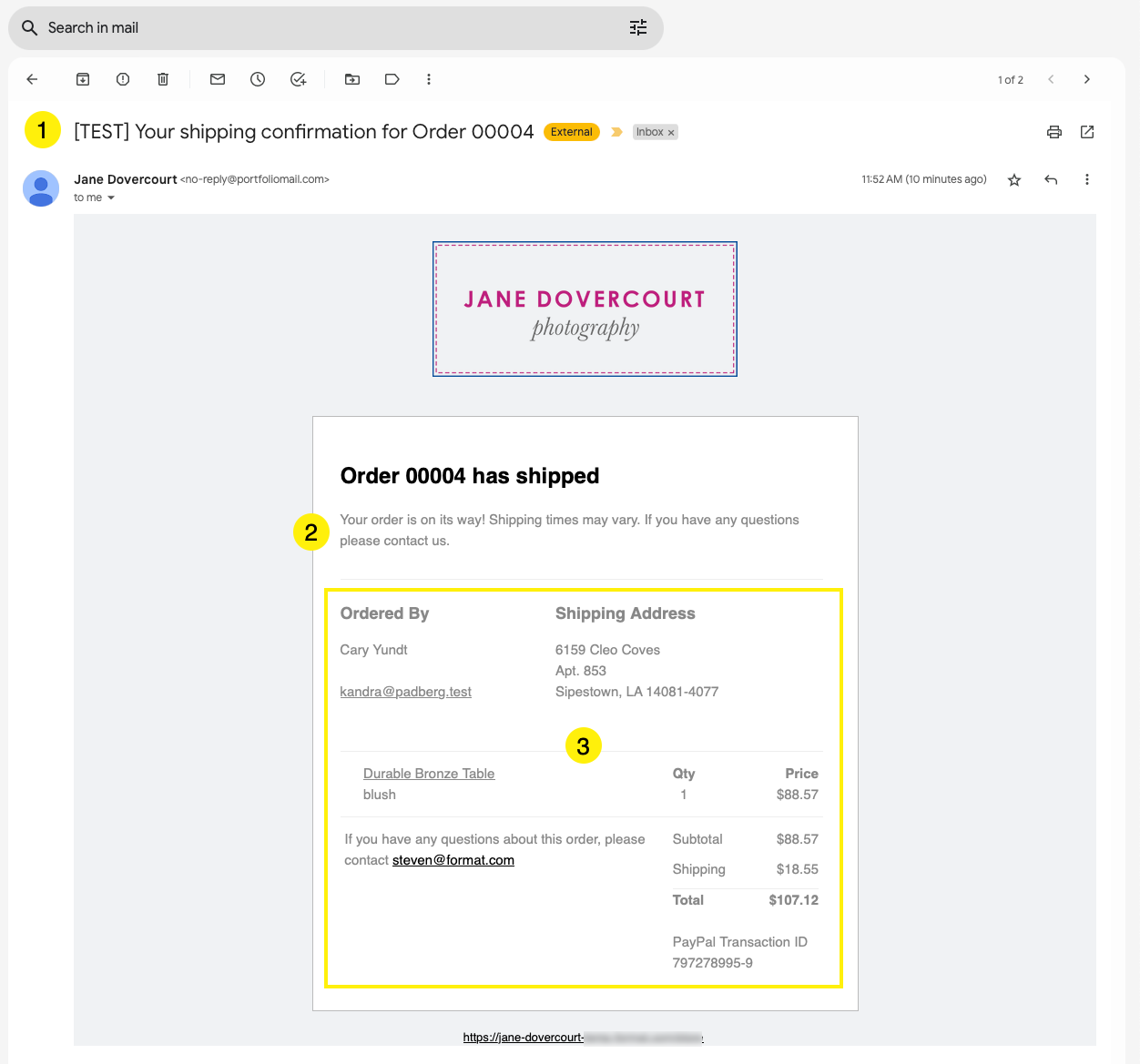 Test Order Confirmation and Shipping Message email examples