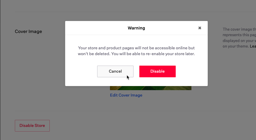 If you disable your Store, a Warning will be displayed advising: "Your store and product pages will not be accessible online but won't be deleted. You will be able to re-enable your store later."