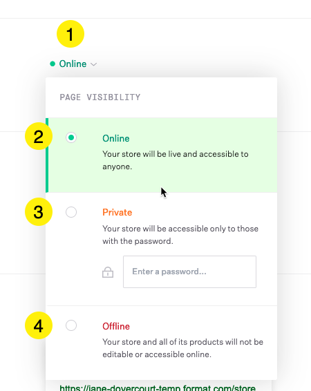 Online: (Default) Your store will be live and accessible to anyone