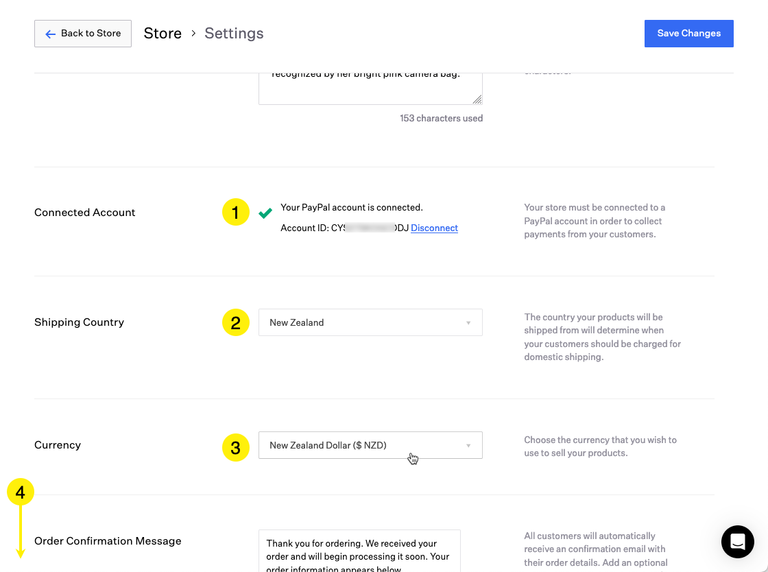 How to configure your Store Settings, including visibility, SEO, connecting PayPal, currency, shipping country, confirmation emails, and more.