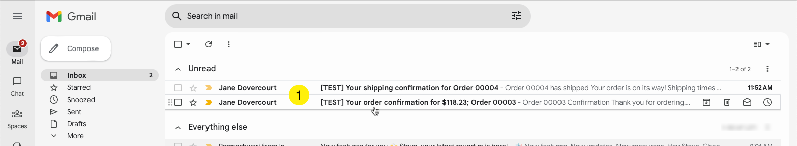 Unread [TEST] Order confirmation and Shipping messages received in your email inbox
