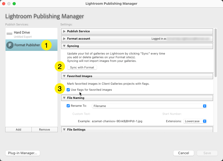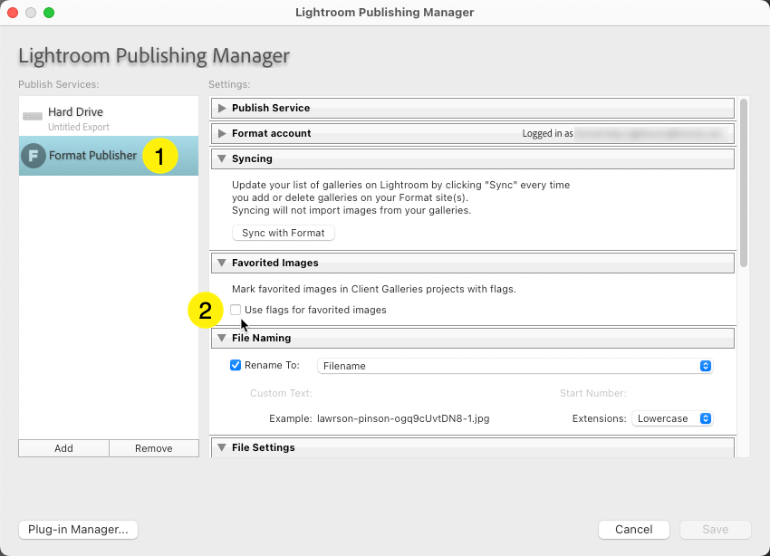 In the Lightroom Publishing Manager select the Format Publisher plugin from the left-hand 'Publish Services' pane