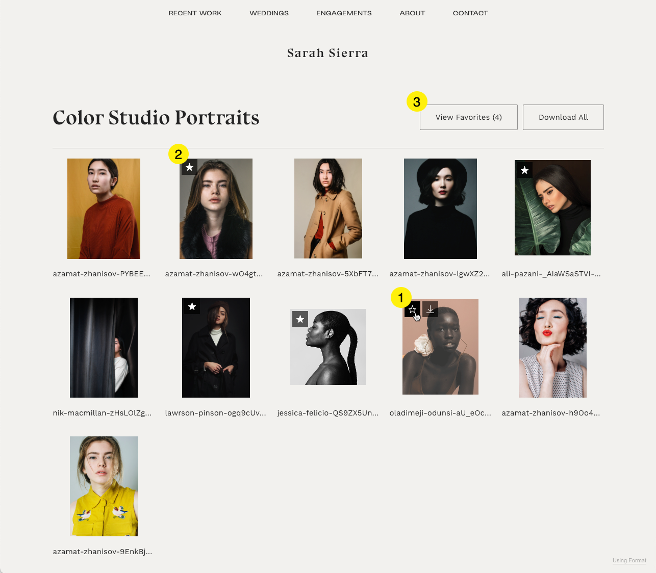 When your Client(s) are viewing their Client Gallery they are able to 'favorite' images with a 'star' icon