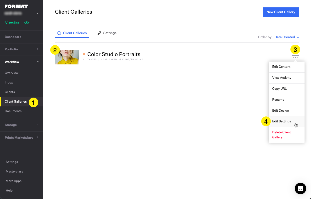 From the left sidebar navigate to Workflow > Client Galleries