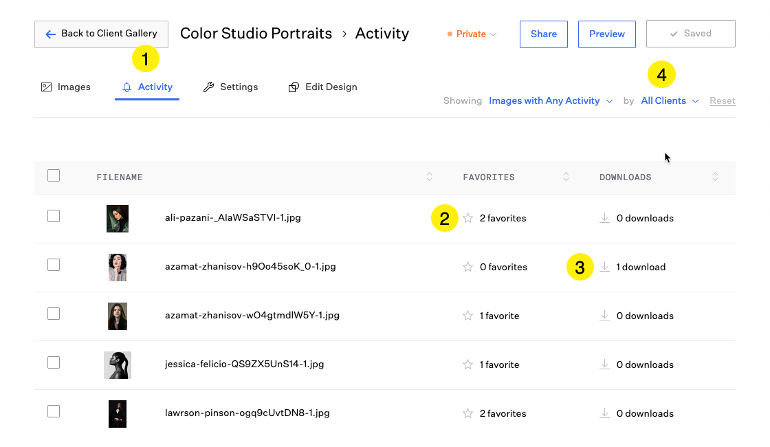 Viewers must enter their email address to view a Client Gallery if favoriting and downloading options have been enabled. This allows you to track favorited and dlownloaded images in the 'Activity' pane.