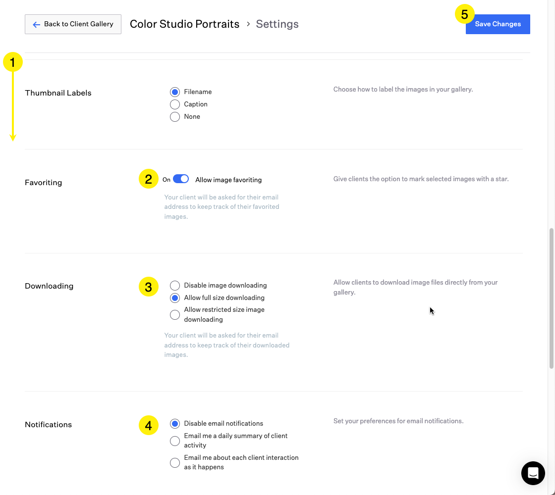 These Settings are specific for individual Client Galleries. Options include page visibility, favoriting, downloading and email notifications.