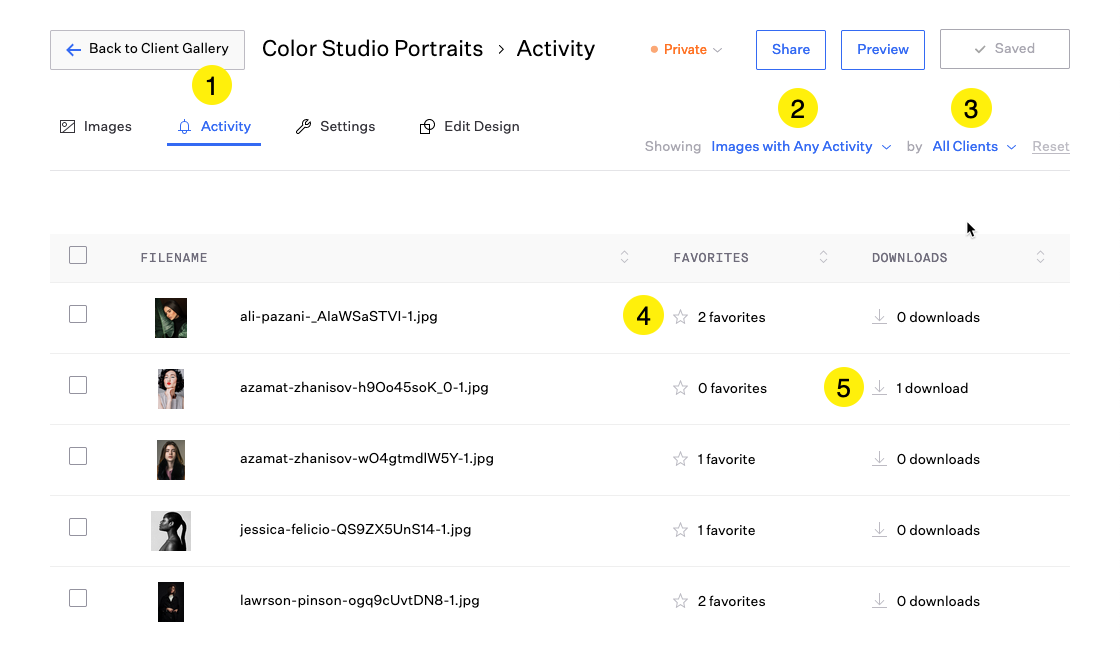 Showing filters include: All Images, Downloaded Images, Favorited Images, Images with Any Activity, and Images with No Activity