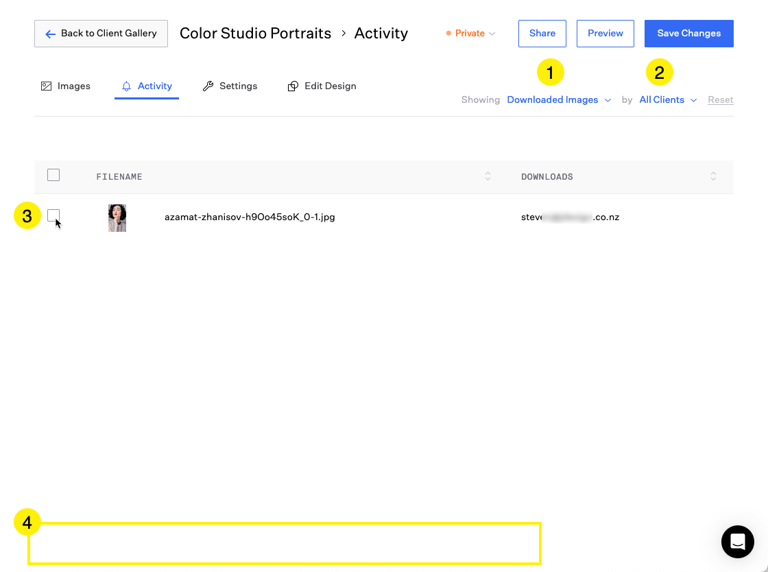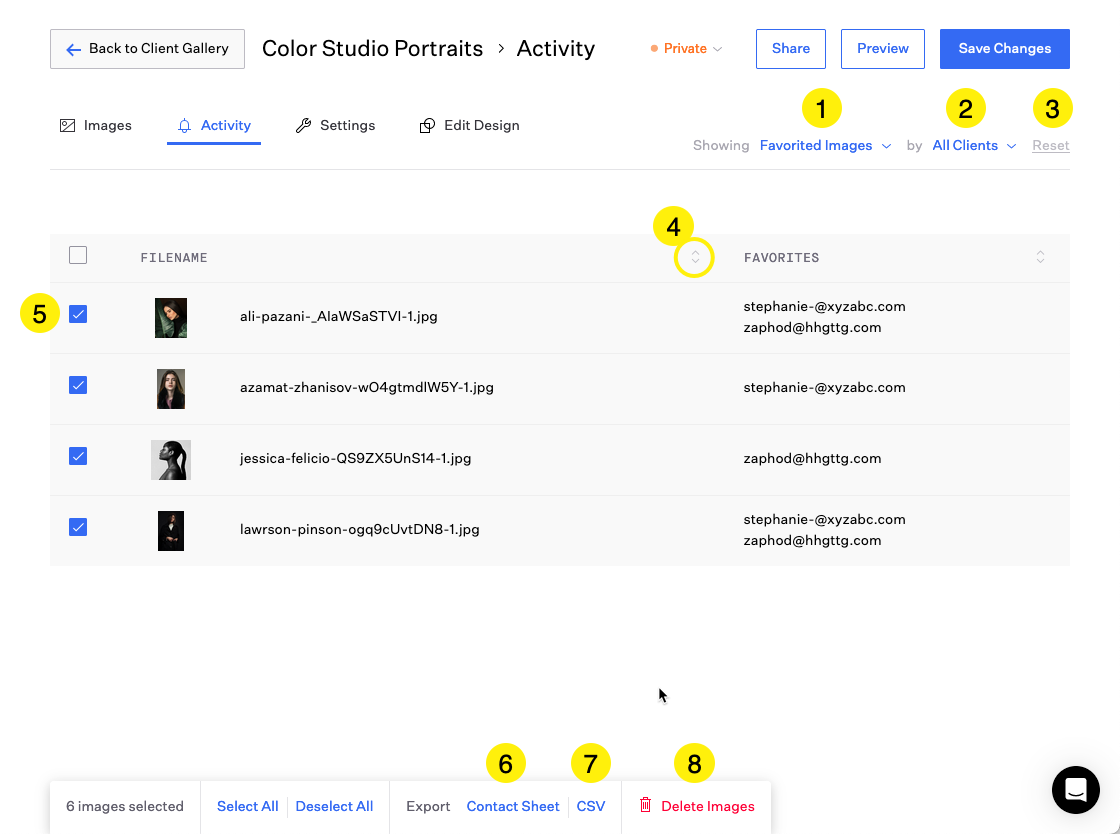 Export a CSV file. See our Client Galleries Activity download CSV file guide