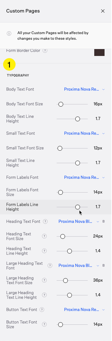 Have more control over the typeface, sizes, and colors on Custom Pages in the Design > Typography > Advanced > Custom Pages panel.
