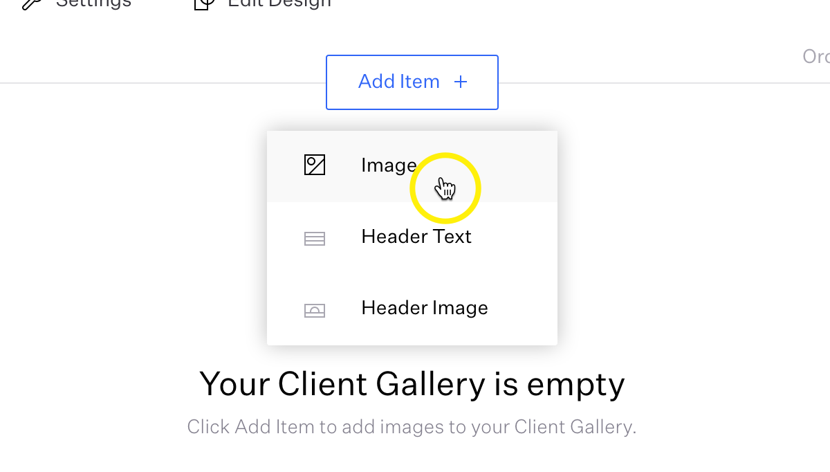 Click 'Add Item +' and select 'Image'. You can also add 'Header Text' or a 'Header Image'