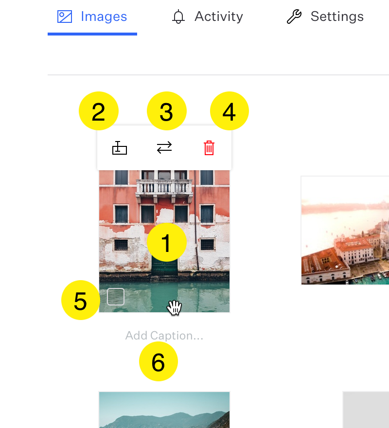 Hover an image thumbnail to see options appear