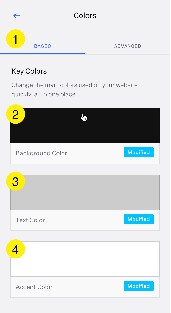 The default setting is the BASIC panel, and changes here affect all content within your site