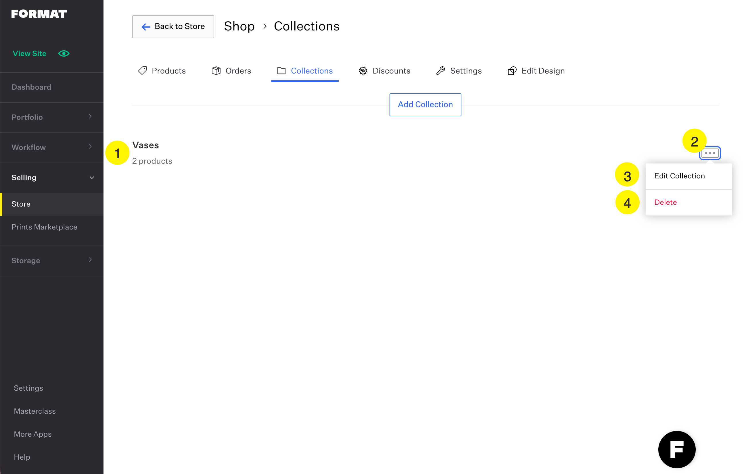 - More Options: Clicking on the ellipsis symbol next to a store product will give you the option to manage that product, including its Collection placements