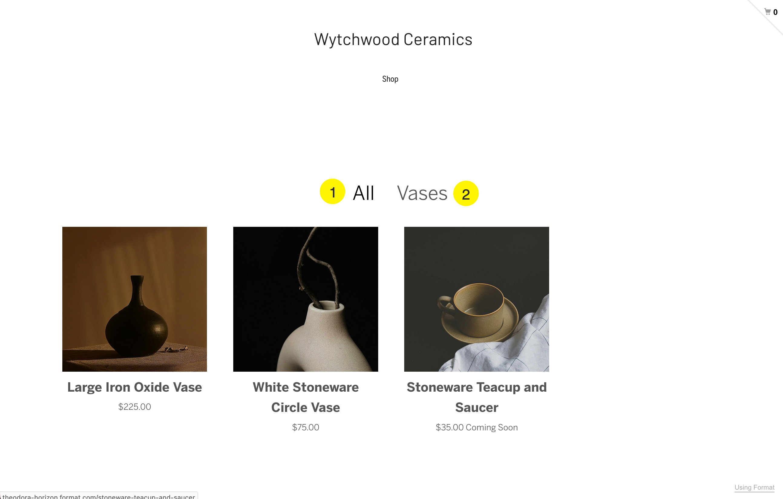 On your live site, Store Collections will appear above your product listings. By default, the "All" Collection will display when a visitor enters your Store. They can then choose between any custom Collections you have created: