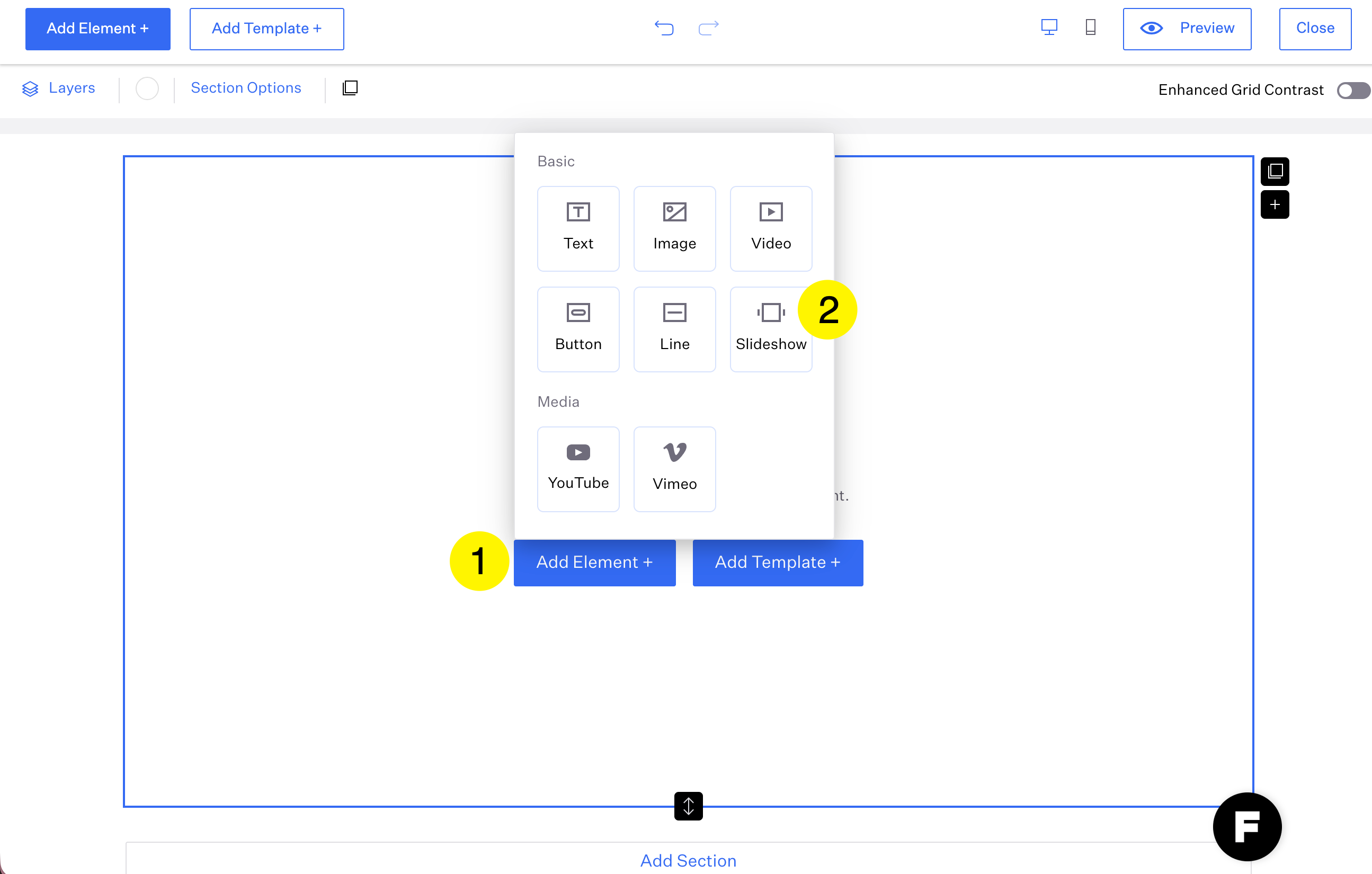 - Slideshow: Select Slideshow to add a Slideshow element to your flex block