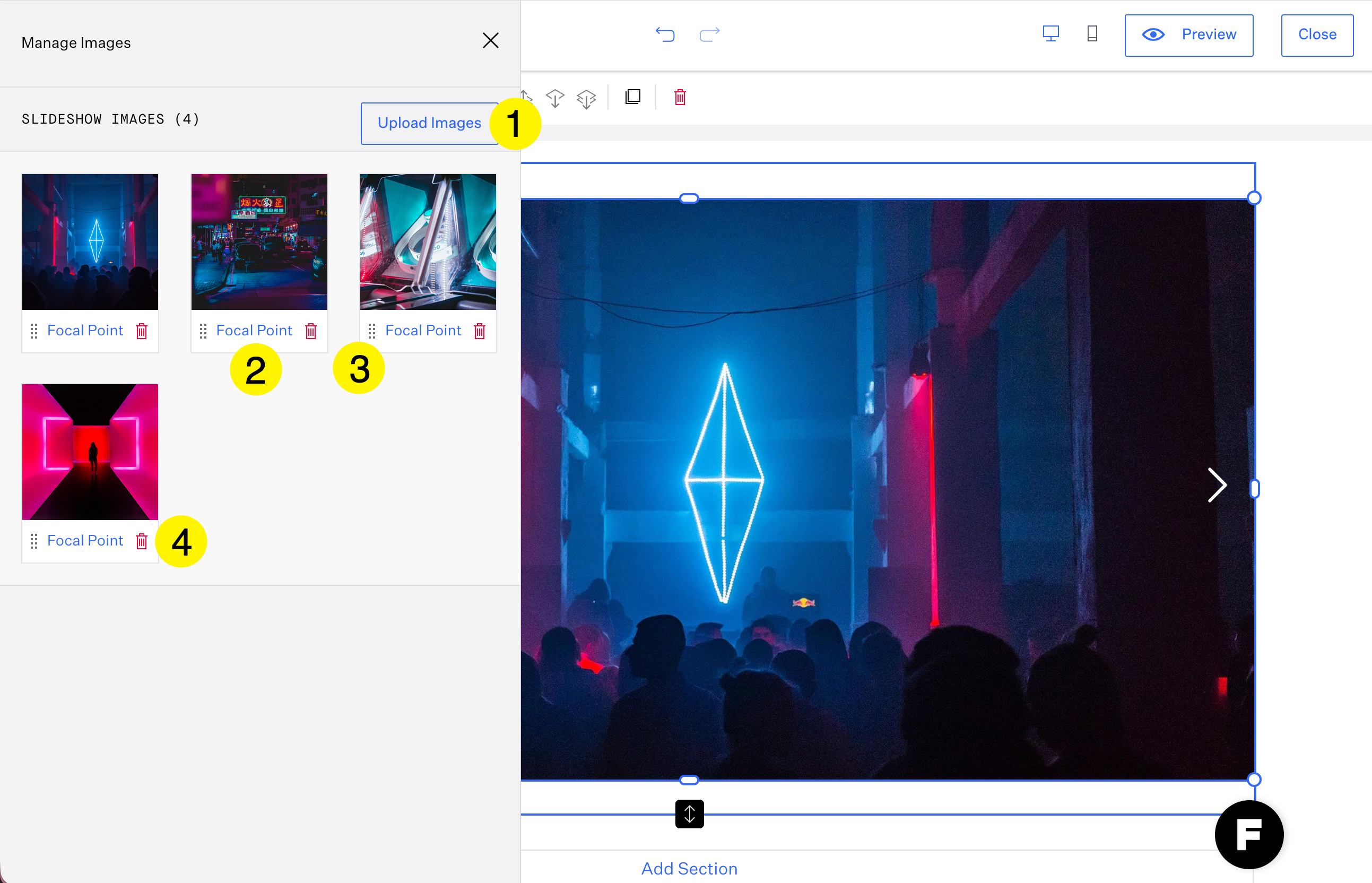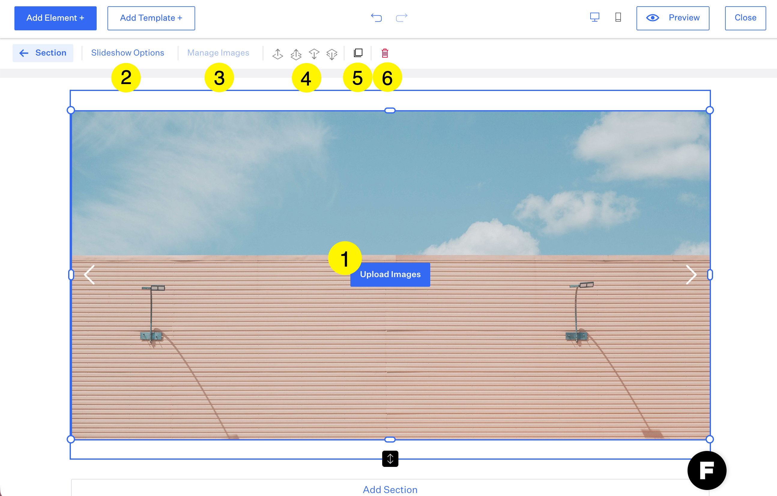 - Upload Images: Upload images to your Slideshow section. This works the same way as uploading images anywhere else on your site. You can have up to 40 images in a single slideshow